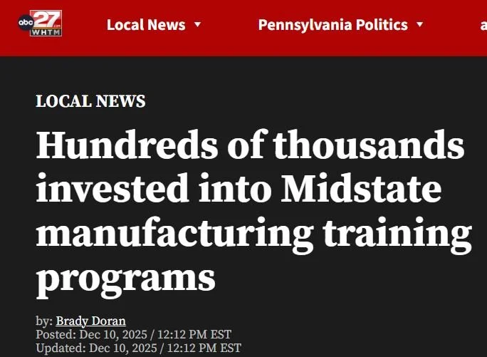 December 2025 - ABC News media article highlighting the $400,000 award earned with the Lancaster County Workforce Development Board to expand Robotic WorX.